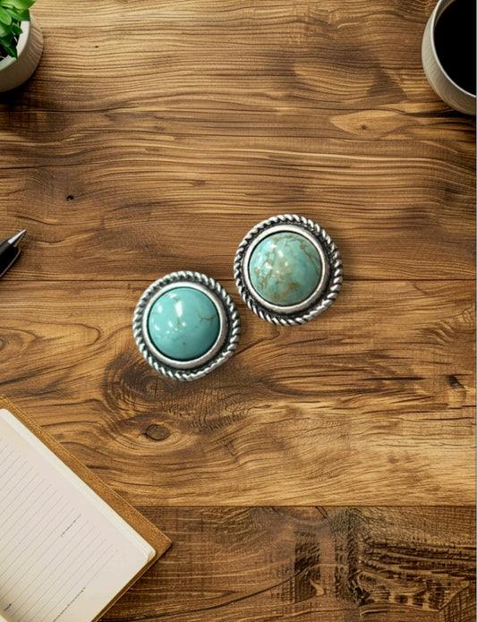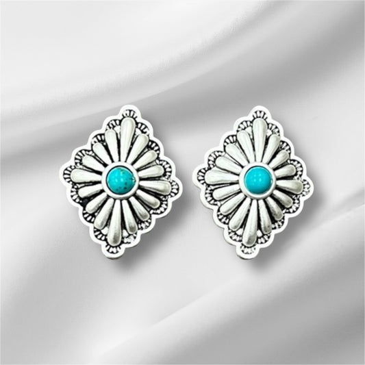 1" Long, Brass Concho Turquoise Stud Earrings – Western Style, Lightweight, Hypoallergenic 724559