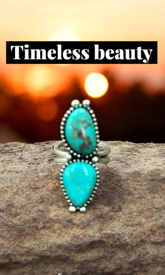 1.5" Long Navajo Turquoise Ring, Brass Dual Adjustable Band, Antique Silver Plate 750456