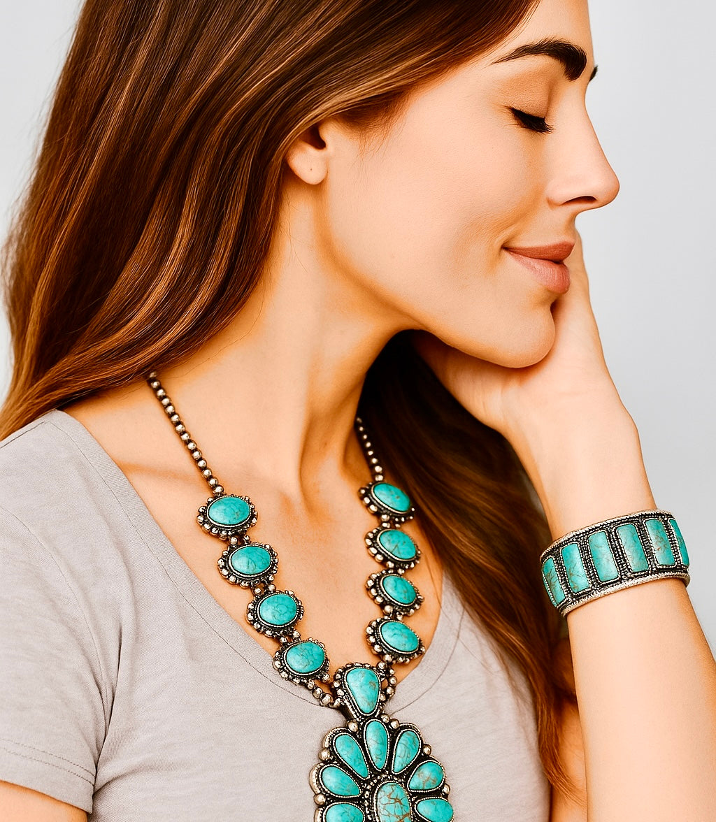 Handmade with care, this full squash blossom turquoise necklace makes a bold...