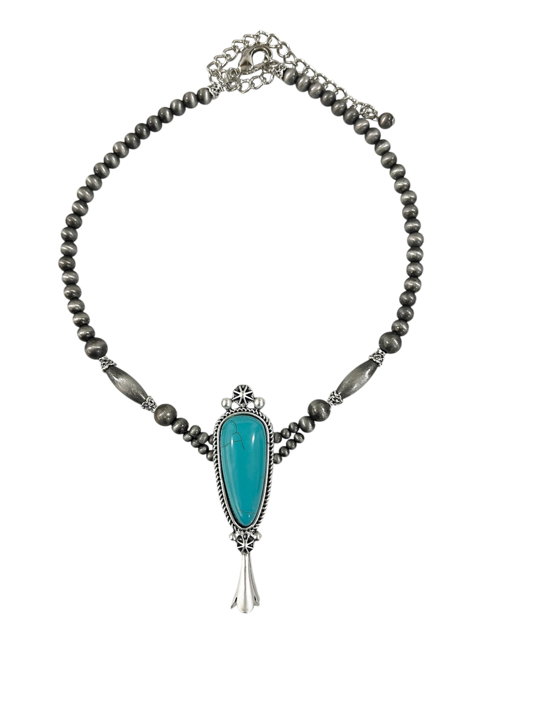 This handmade Navajo bead necklace blends traditional Southwestern artistry with a bold modern statement. The strand features a mix of polished round beads and elongated 18mm Navajo beads, creating rich depth and texture. At the center hangs a 3" squash naja turquoise pendant, plated in antique silver for an authentic Western look. With an adjustable length of 15" plus a 5" extender, this necklace is versatile enough for layering or wearing alone. Each piece is one-of-a-kind, reflecting the natural beauty and variations of genuine stones.