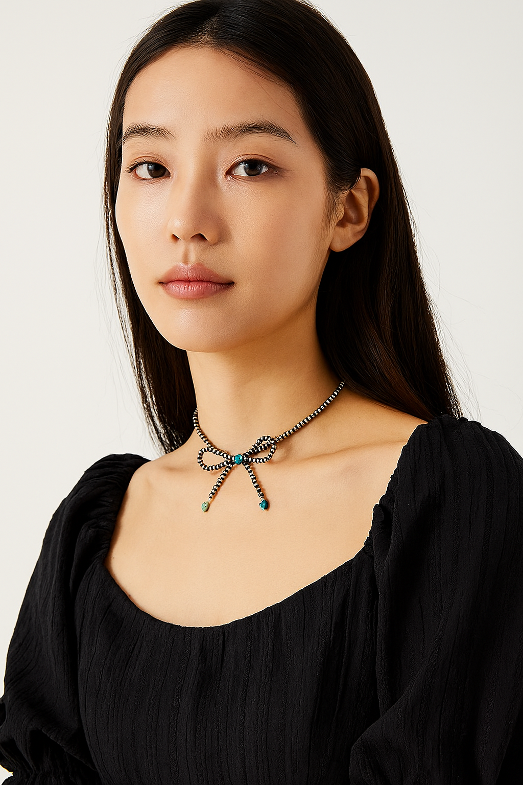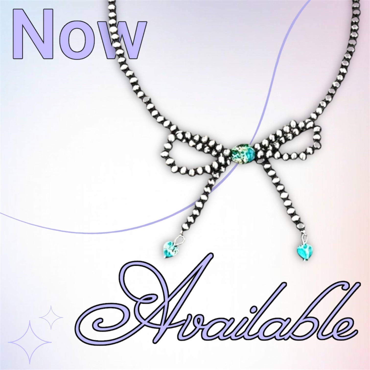 This 15" to 20" long handmade necklace blends tiny 4mm silver Navajo beads with beautifully arranged 10mm rondelle and 6mm heart-shaped gemstones. The charming bow-inspired design and delicate scale make it ideal for layering or wearing alone. Each natural stone is unique, offering subtle variations that highlight the handmade craftsmanship. With a lightweight feel of just 12 grams and hypoallergenic materials, it's perfect for daily wear with a Western, boho, or romantic touch.