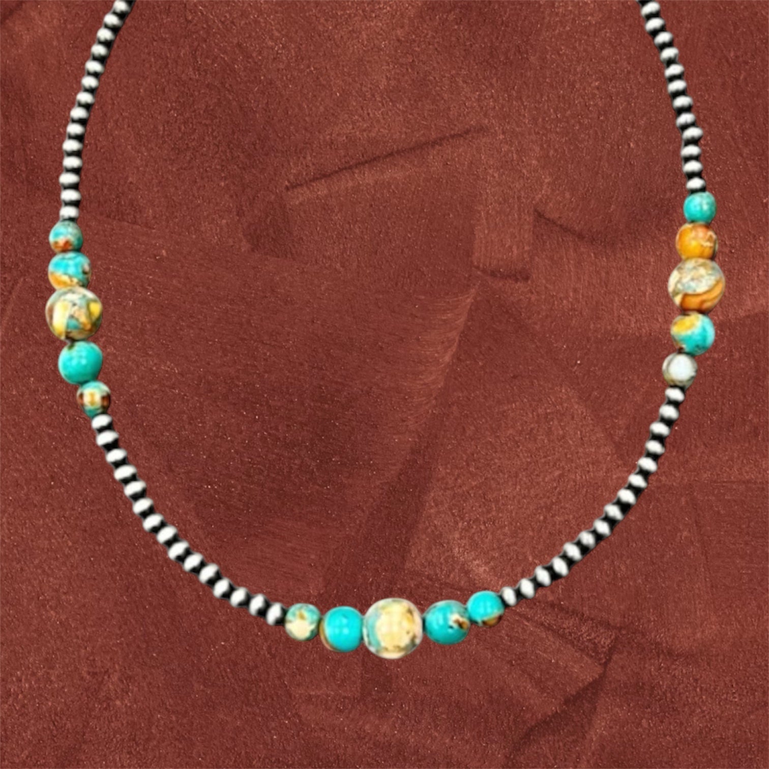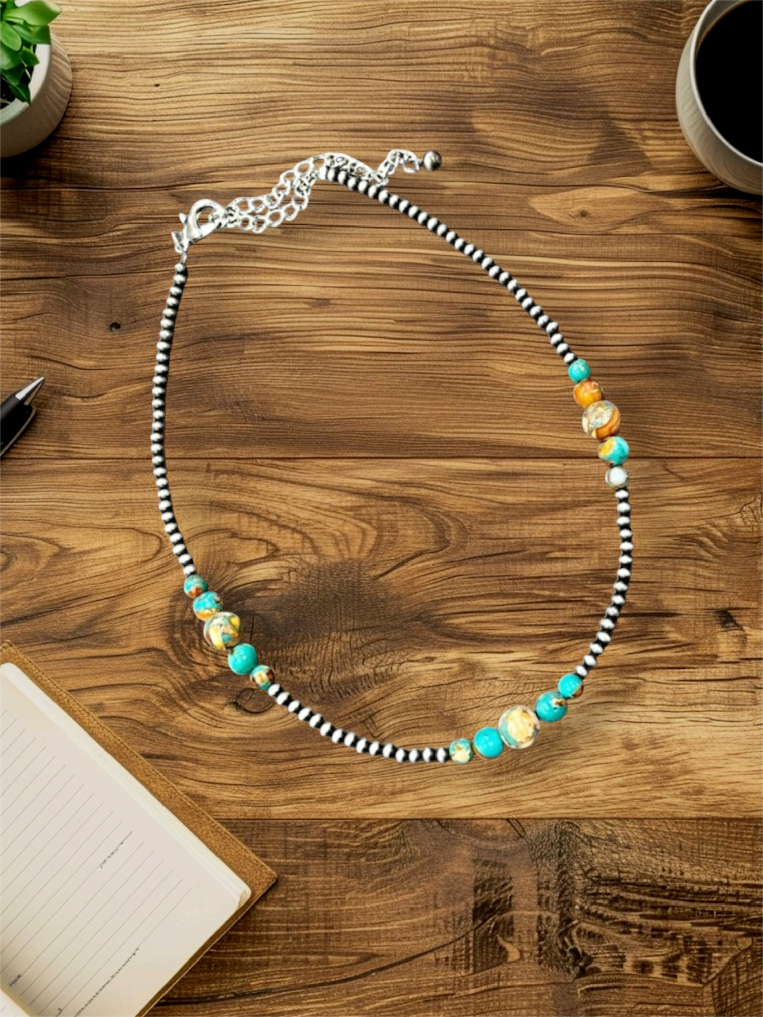 This handmade 15" to 20" Navajo clustered gemstone necklace blends rustic silver-tone Navajo beads with vibrant gemstones in graduated sizes from 4mm to 10mm. The clustered arrangement creates texture and depth, giving the piece a bold yet refined Western feel. Each natural stone has slight variations, ensuring that every necklace is one-of-a-kind. Lightweight at just 20 grams and crafted from hypoallergenic materials, it’s perfect for daily wear or special occasions.