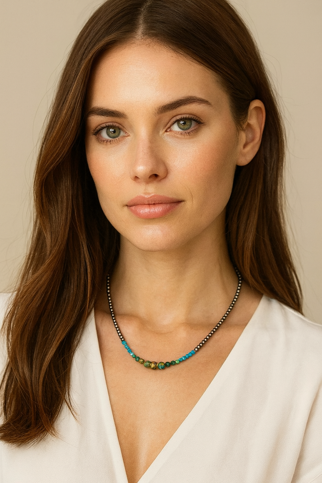 Elevate your look with this handmade clustered gemstone and Navajo bead necklace, designed for both elegance and versatility. The necklace pairs tiny 4mm polished Navajo beads with 4mm rondelle gemstones and clustered 6mm & 8mm round gemstones, creating a layered and textured finish that stands out.