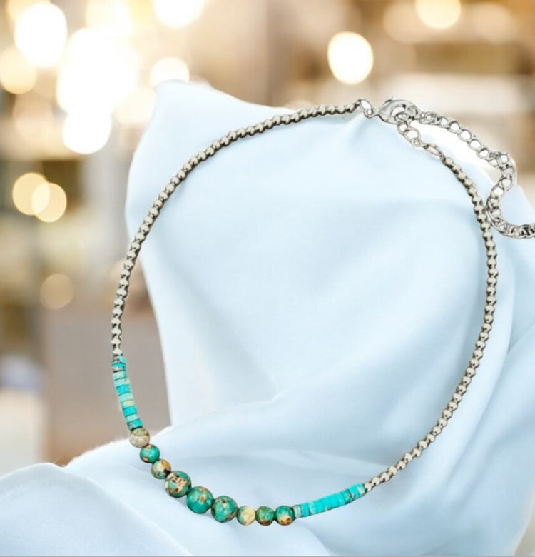 This handmade clustered gemstone and silver Navajo bead necklace blends Southwestern charm with modern elegance. The piece features tiny 4mm silver Navajo beads paired with 4mm rondelle gemstones and clustered 6mm & 8mm round gemstones, giving it rich texture and dimension.