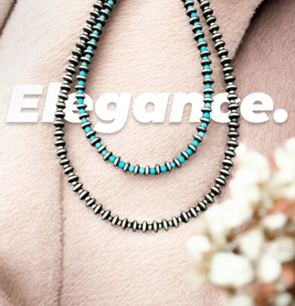 Elevate your Western-inspired style with this handmade 2-strand Navajo bead and turquoise necklace. Designed with attention to detail, it combines 8mm rondelle Navajo beads with 4mm synthetic turquoise to create a classic Southwestern look.