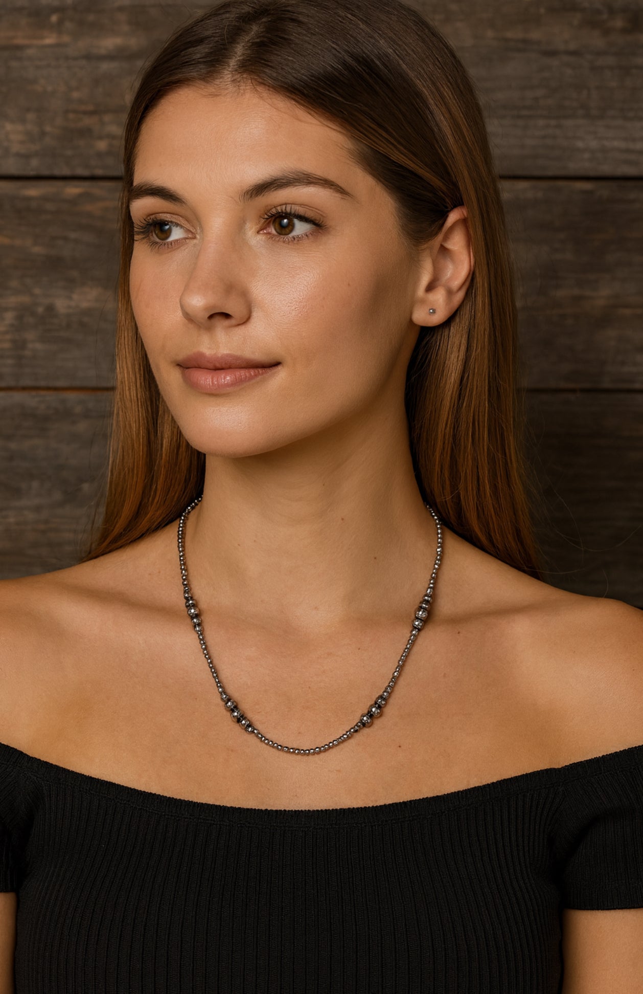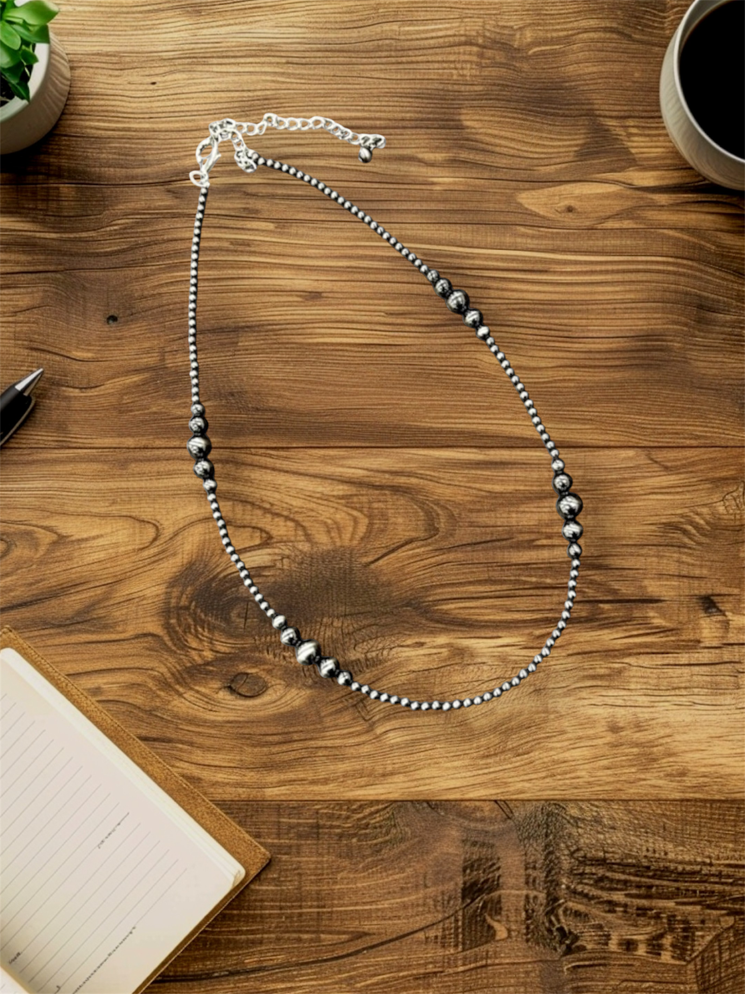This handmade 22" to 27" necklace features a mix of 4mm silver-tone Navajo beads and clustered 6mm, 8mm, and 10mm polished beads for a textured yet elegant Western look. The polished finish adds brightness and a refined touch, making it perfect for both casual and formal outfits. At just 15 grams, it’s lightweight and comfortable for extended wear, and the hypoallergenic materials make it safe for sensitive skin.