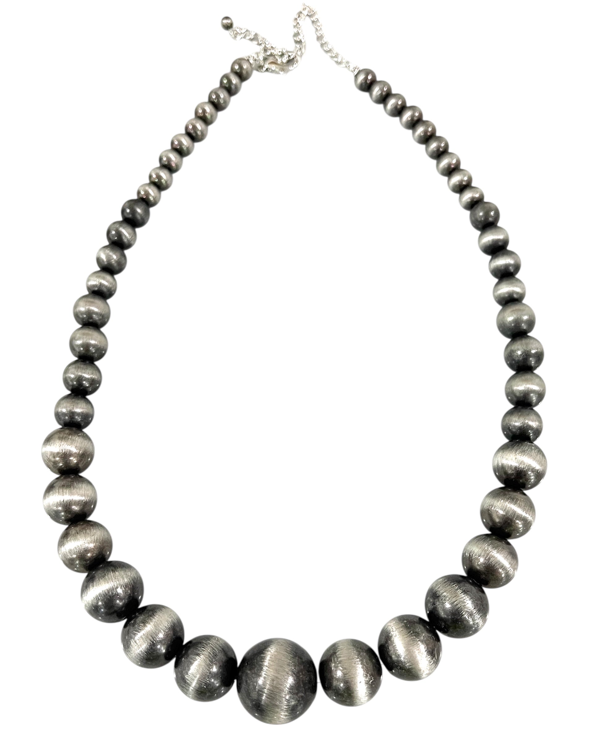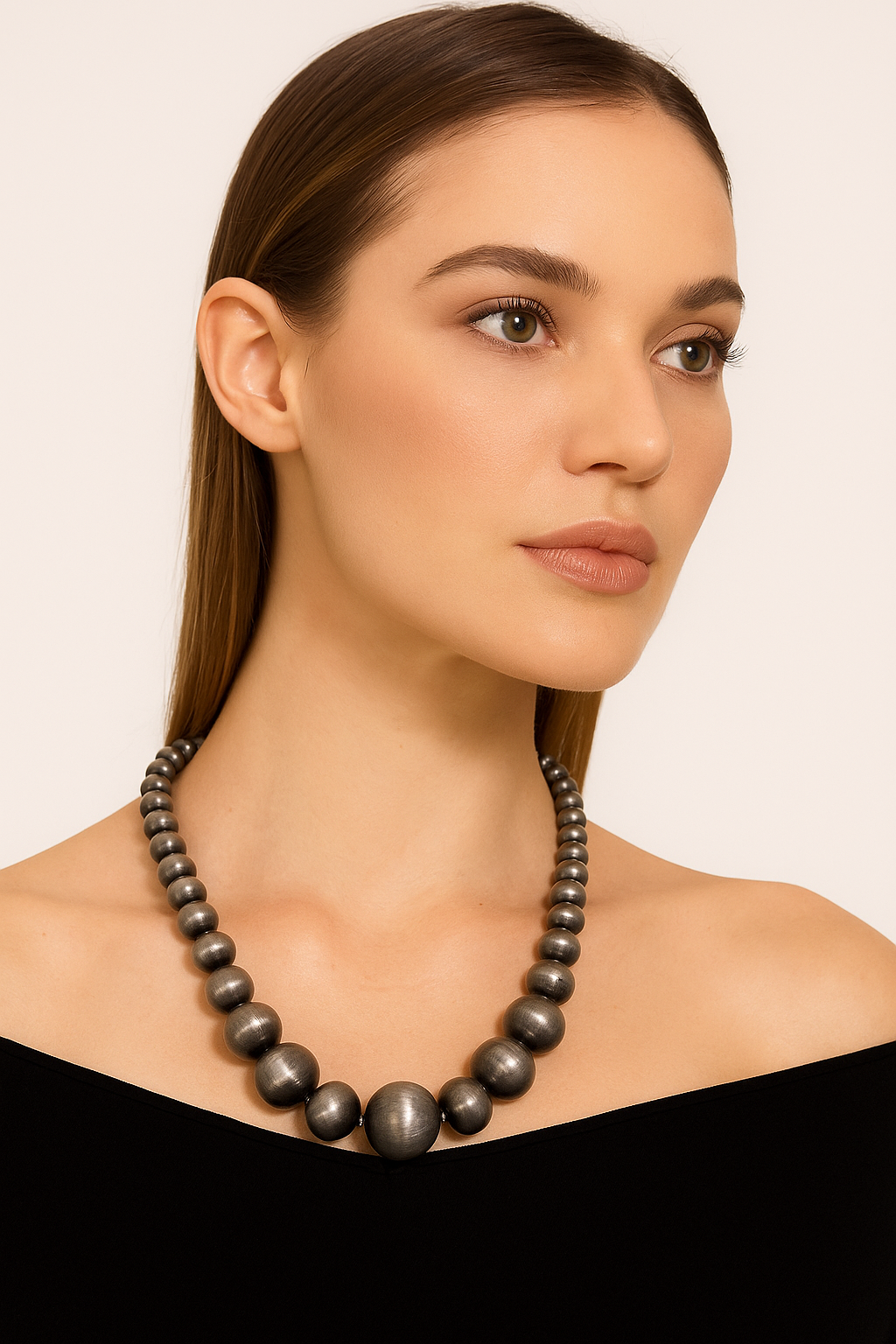 Make a bold statement with this handmade Very-Big Navajo bead necklace, designed with graduated bead sizes up to 25mm. The graduated arrangement — from 10mm to 25mm — creates a striking layered effect, offering both balance and presence.