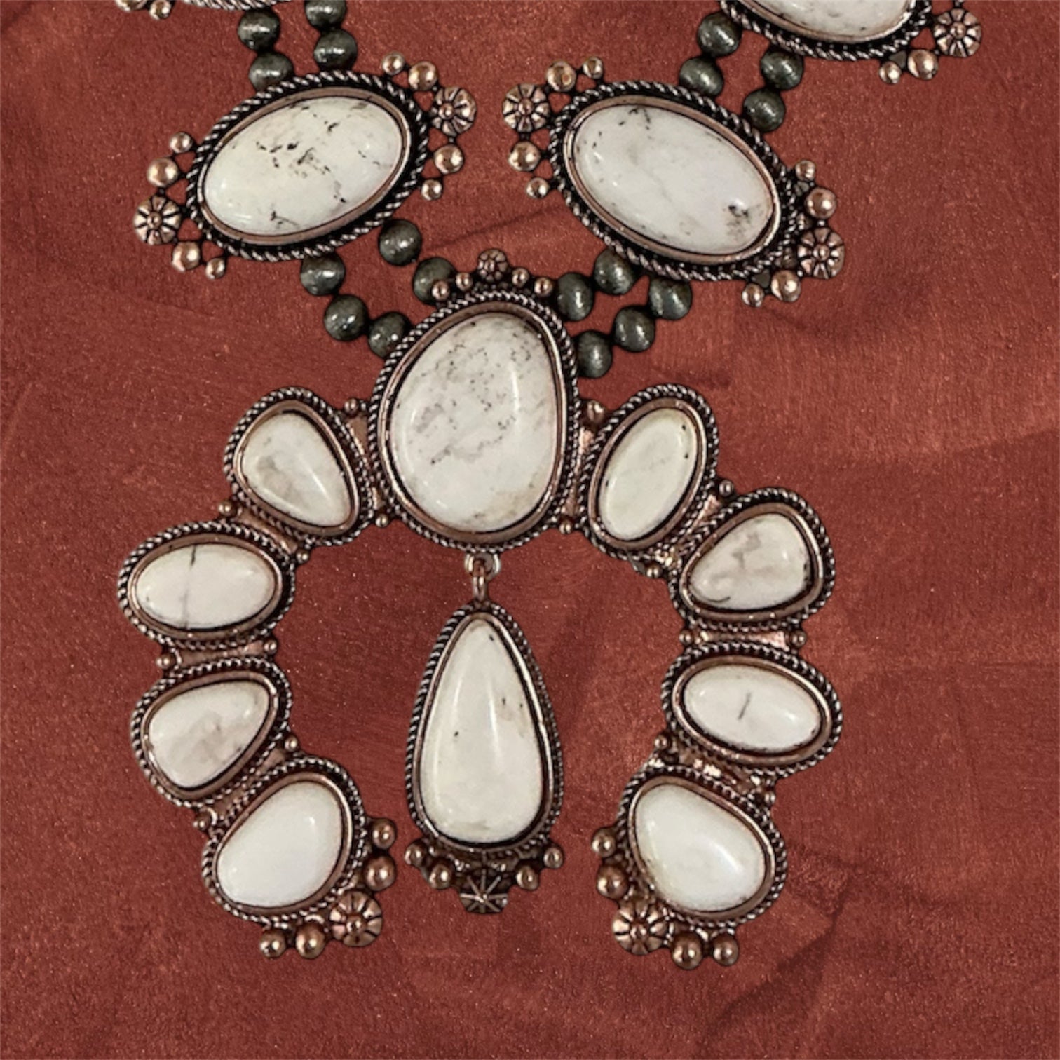 The centerpiece is a 3-inch white turquoise squash blossom pendant, set on antique copper-plated alloy metal, blending natural elegance with a vintage Western finish. Since natural turquoise varies in size, color, and shape, each necklace is unique, giving you a one-of-a-kind accessory.