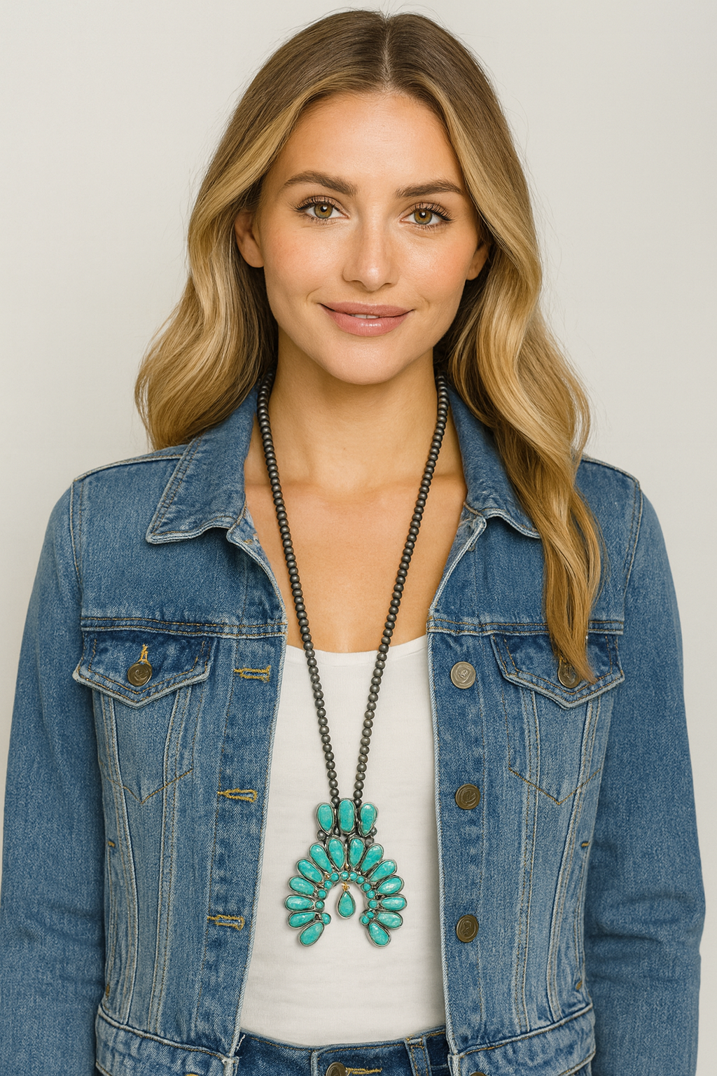 Make a bold Western statement with this oversized squash blossom turquoise necklace. Handcrafted with alternating 6mm and 12mm Navajo beads, this necklace showcases a large 4" turquoise pendant in antique silver plating. The adjustable length (30" with a 5" extender) makes it versatile and comfortable, while the striking design highlights the beauty of Southwestern jewelry tradition. Each piece is one-of-a-kind, with natural stones varying slightly in shape, color, and size.