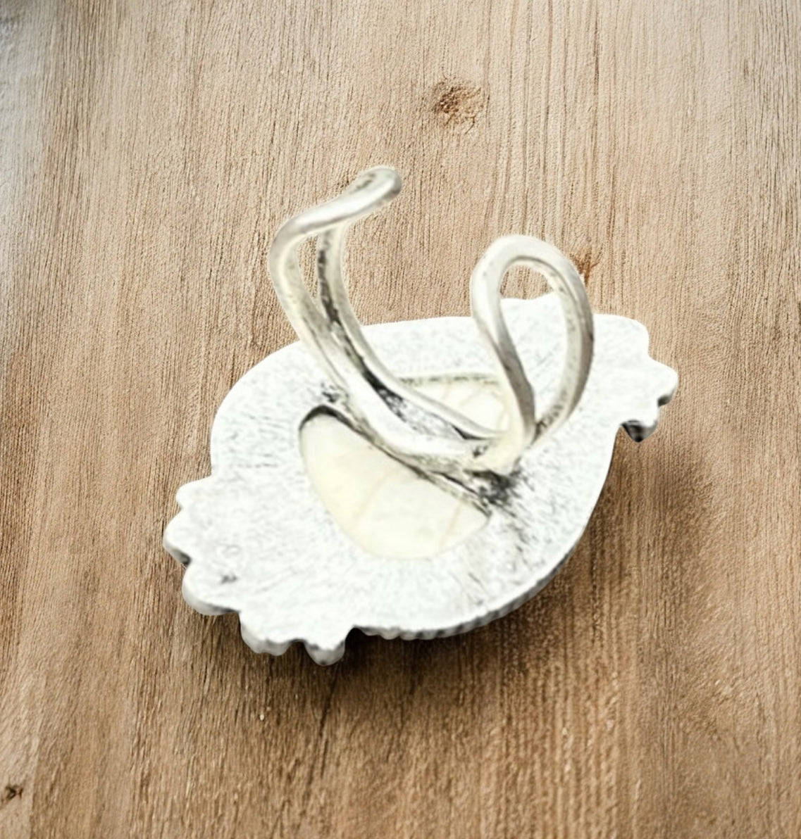 Make a bold statement with this oversized 1.5" long white turquoise ring. Designed with a sturdy brass dual band, this piece offers comfort and adjustability while highlighting the natural beauty of the stone. Each ring is one-of-a-kind with unique variations in color, size, and veining, making your jewelry truly special.