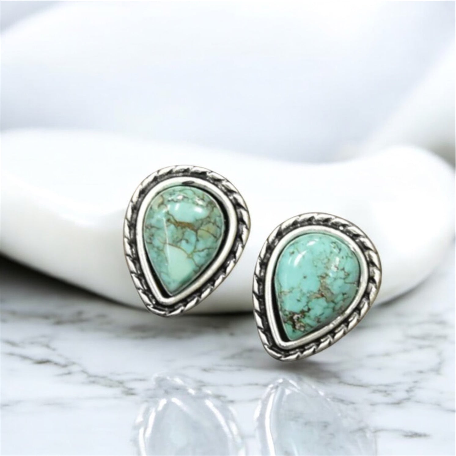 Crafted with 13mm turquoise-style stones set in antique silver-plated alloy metal, they bring a pop of Southwestern color to any outfit.