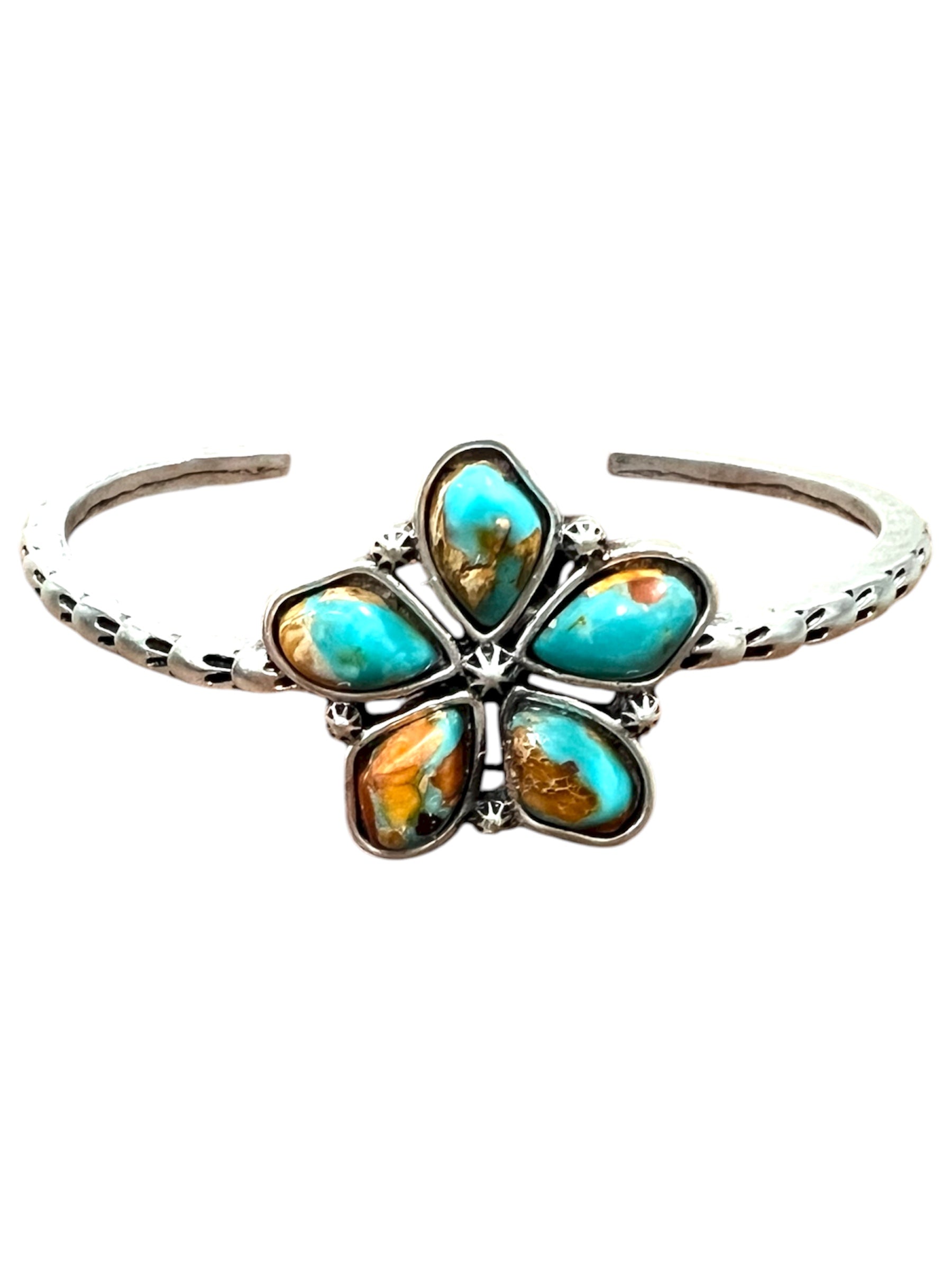 Add a touch of Southwestern beauty with this Navajo Gemstone “C” Cuff Bracelet. Featuring a detailed floral gemstone centerpiece and a slim antique silver band, this bracelet captures authentic Western charm. Each natural stone varies slightly in color and pattern, making every piece unique. Perfect for layering or wearing solo for a refined boho-western look.