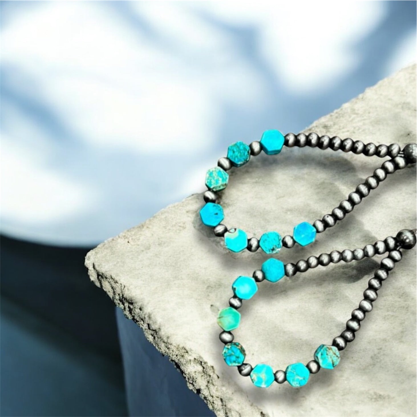 Handmade with turquoise-style hexa gemstones and 4mm Navajo beads, these drop earrings bring authentic Western elegance to any outfit.