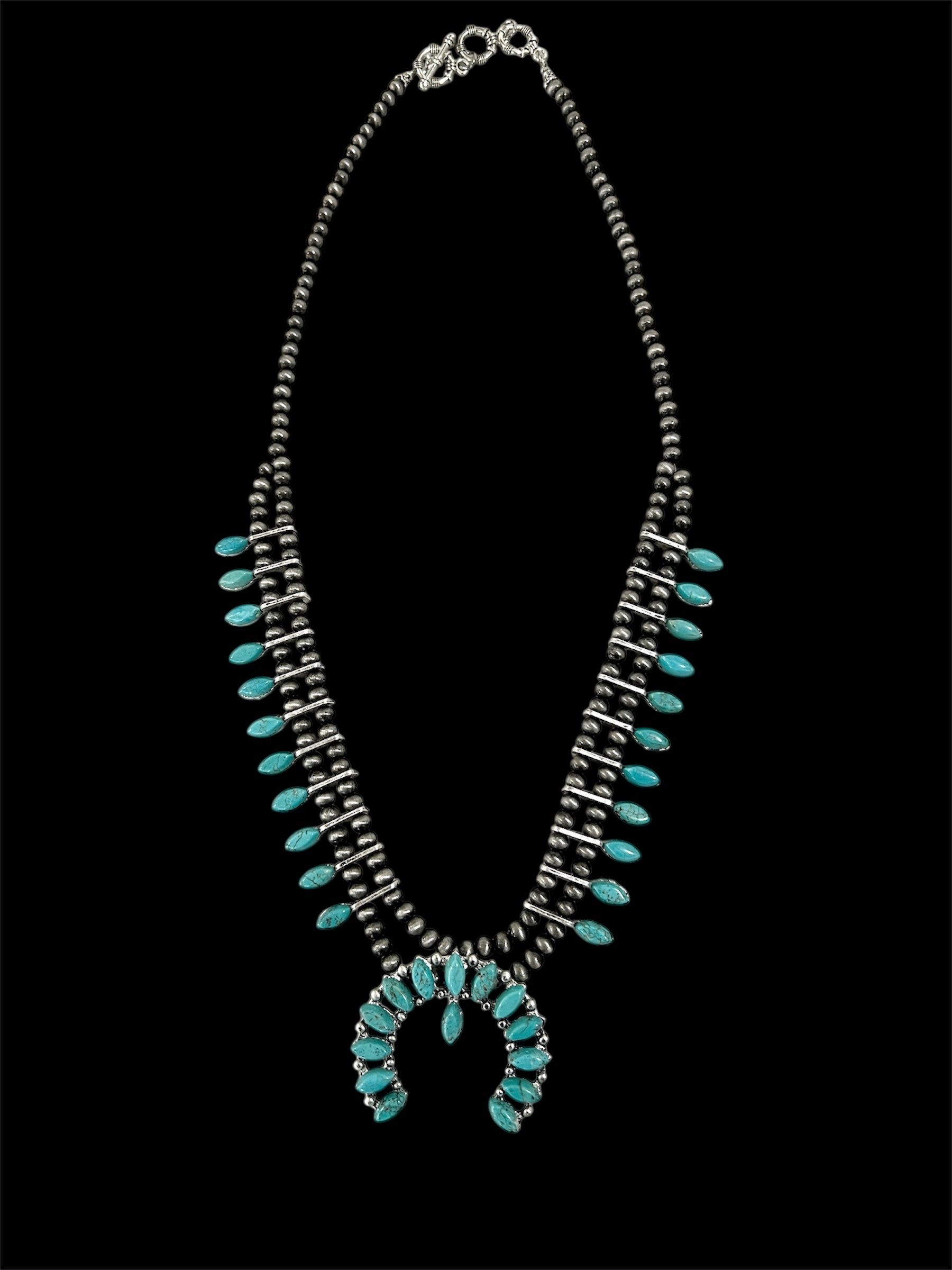 This handmade turquoise squash blossom necklace features classic Navajo-style silver beads and a detailed turquoise blossom pendant.