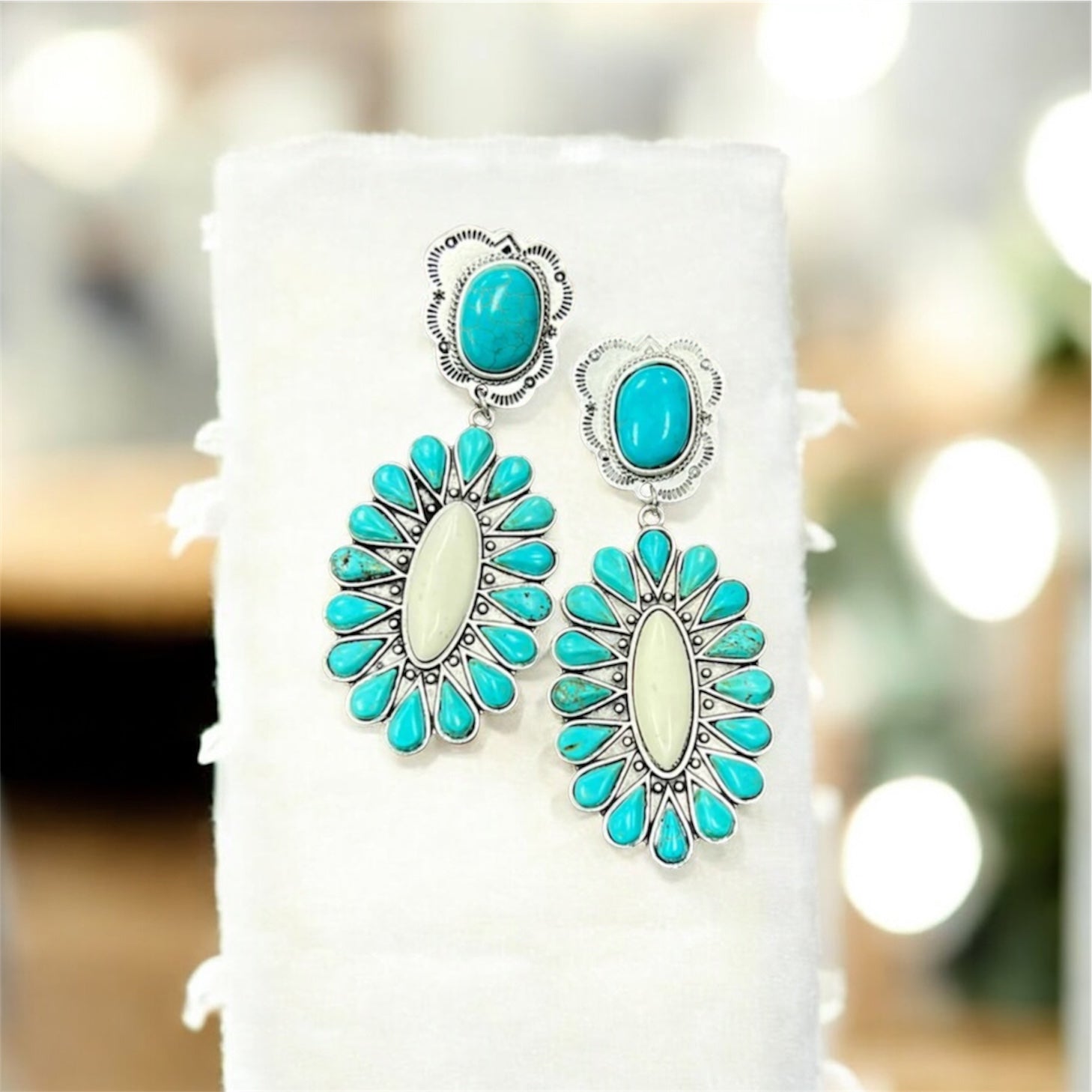 Each piece is handcrafted with genuine turquoise-style stones, featuring an antique silver-plated finish and rustic details that bring out its vintage cowgirl charm.
