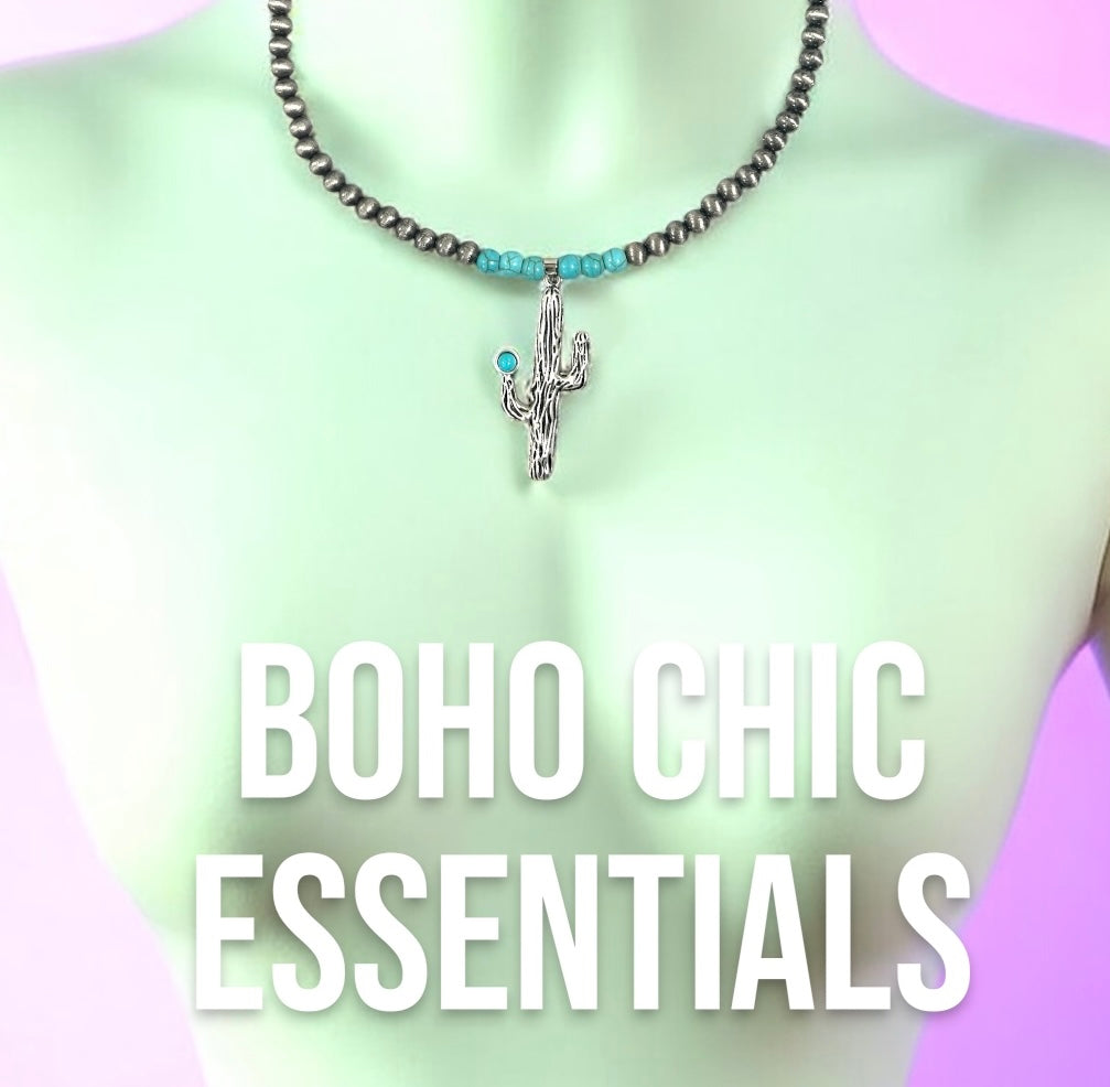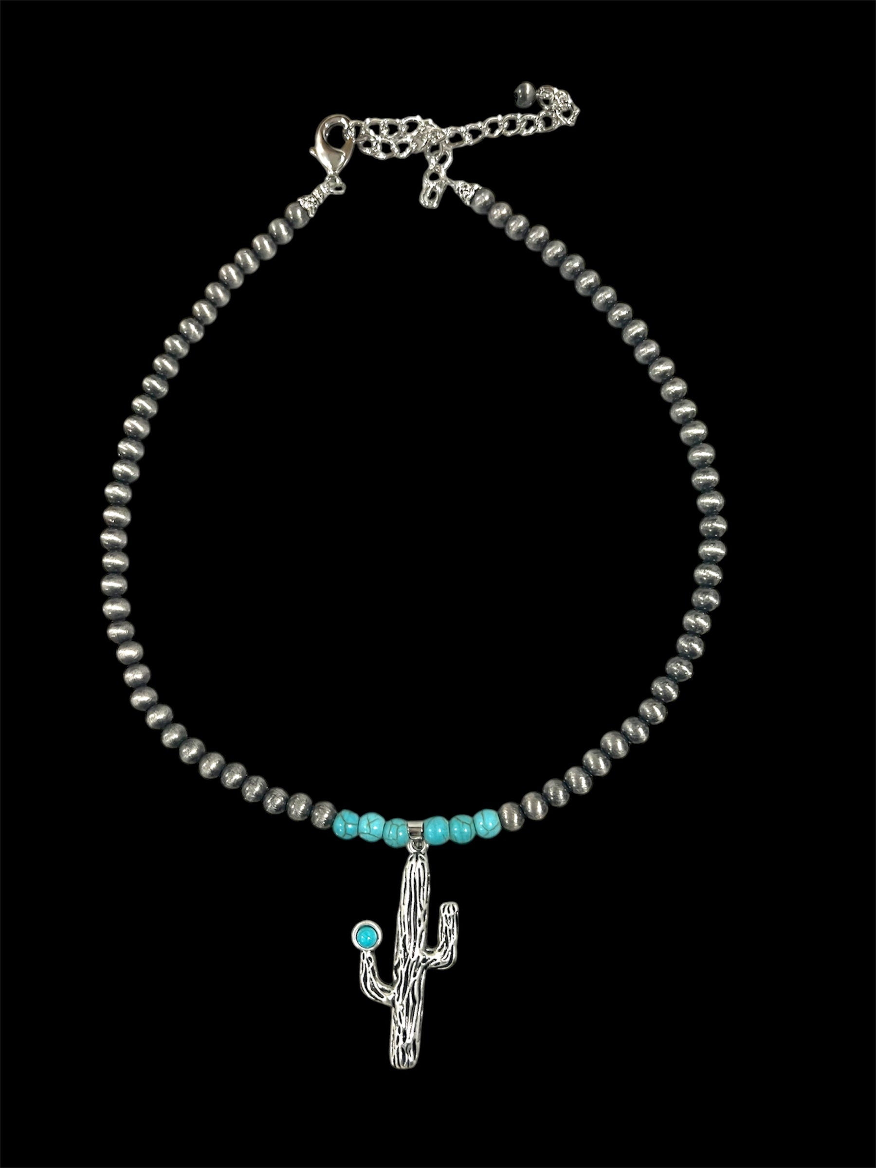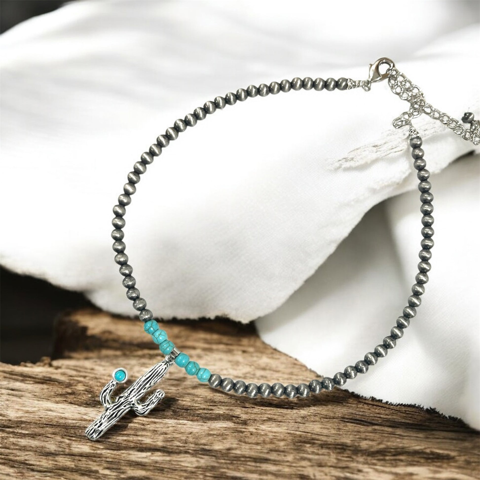 Bring the spirit of the Southwest to your style with this Turquoise Cactus Navajo Pearl Necklace. Featuring antique silver Navajo-style beads and a detailed cactus pendant accented with turquoise stones, this necklace captures authentic Western charm. Perfect for layering or wearing solo, it’s a versatile statement piece that adds rustic flair to any outfit.