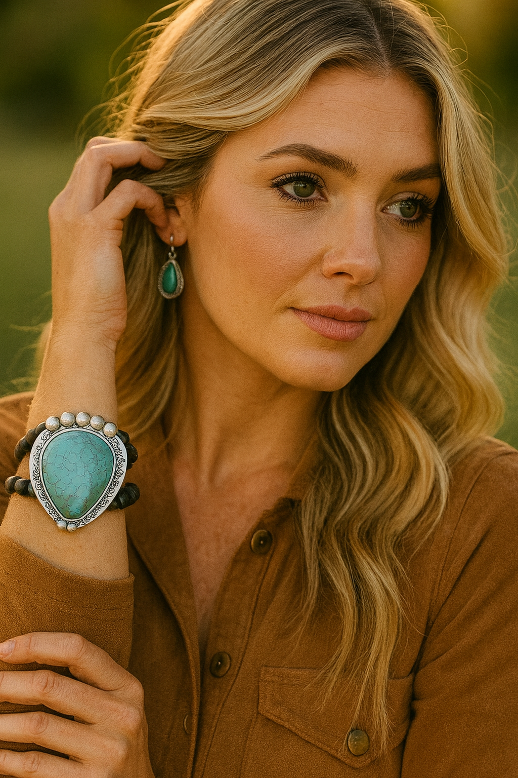 Make a bold Western statement with this Handmade 2-Strand Navajo Turquoise Stretch Bracelet. Featuring genuine turquoise stones and classic 8mm Navajo-style beads, this piece combines rustic charm with standout style. The large 2.7" turquoise centerpiece, set in antique silver-plated alloy, adds a dramatic Southwestern touch. Perfect for layering or wearing solo for a statement look.