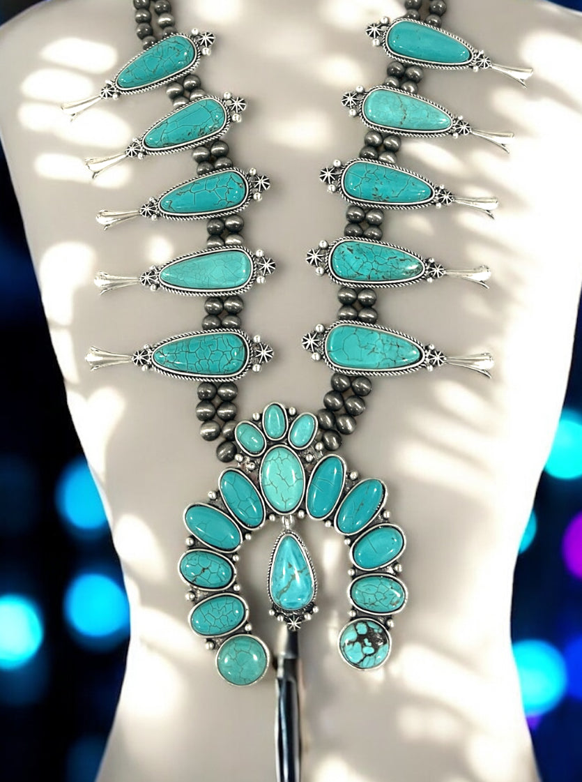 This Western violet-point squash blossom necklace combines natural stone detailing with soft violet highlights to create a unique and elegant Western-style statement piece. The iconic Navajo-style blossom silhouette adds depth and character, making it perfect for cowgirl outfits, rodeo looks, festivals, or special occasions.